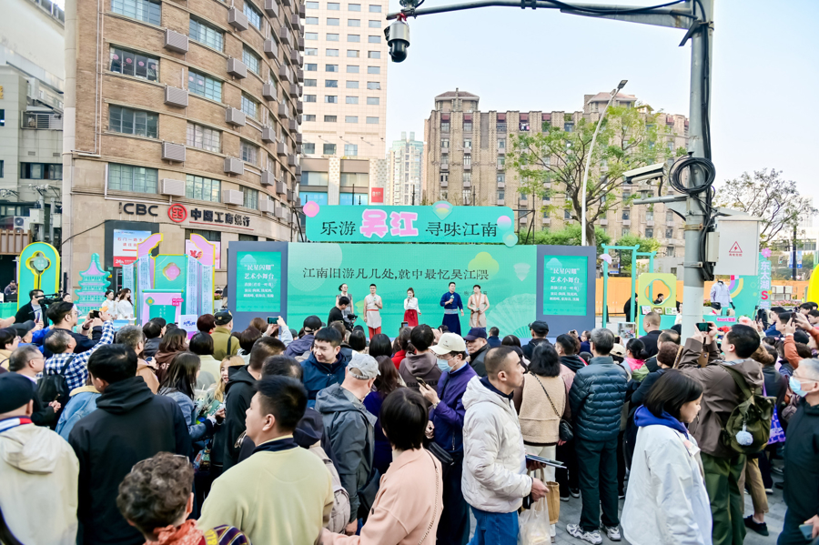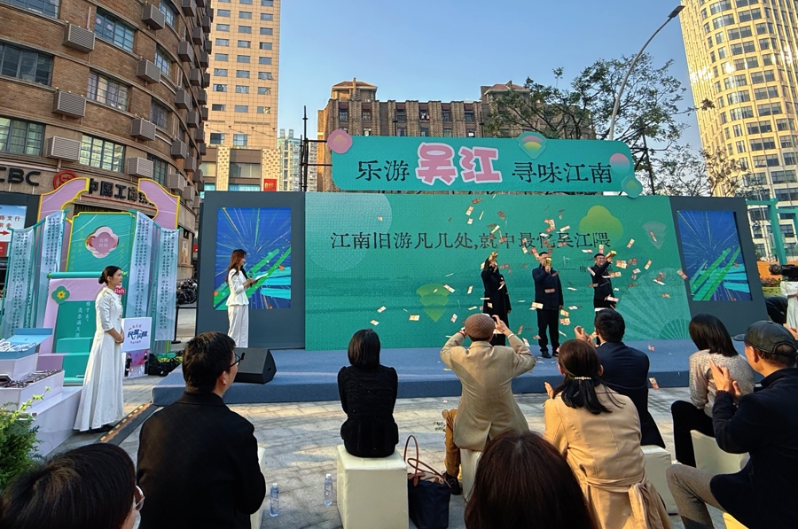 “吴江路介绍吴江区”“吴江区让阿拉去旅游”……当太湖渔歌唱响吴江路,在街头快闪的轻松互动里,“乐游吴江寻味江南”吴江秋冬文体旅消费季推介正式拉开大幕。现场动态展陈以“潮玩+美宿”“匠心+时尚”为核心主题,东太湖S湾、丝绸时尚沉浸式体验场景、苏式茶食的软糯香甜、优质农副产品的田园气息……一系列吴江特色好物鲜活呈现,引得过往市民游客纷纷驻足拍照打卡。