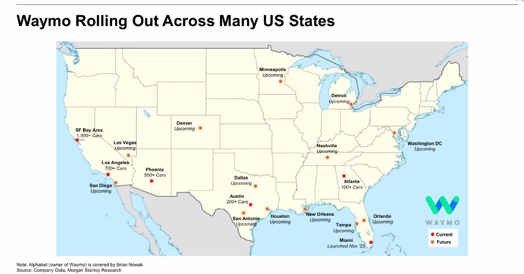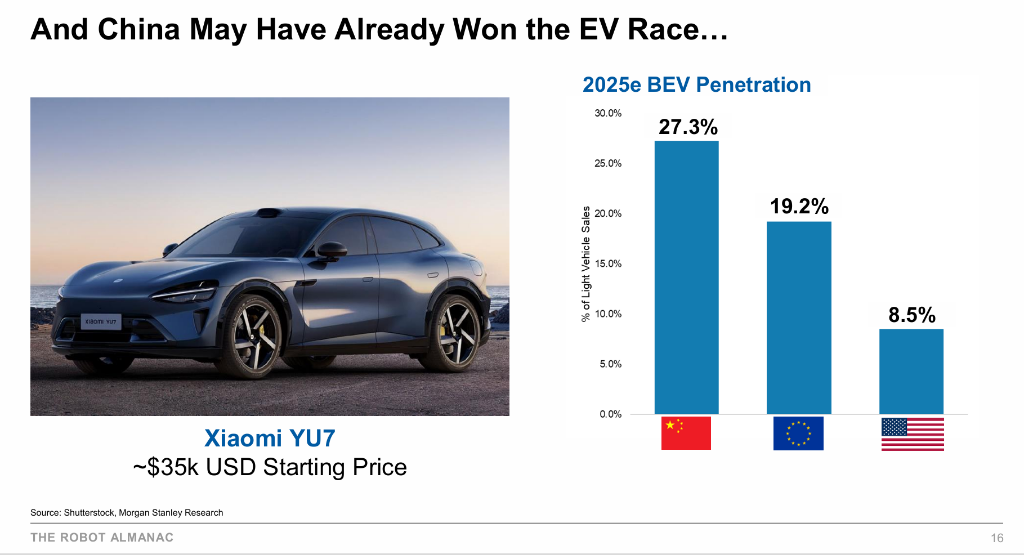 大摩在报告中指出,中国可能已经赢得了电动汽车竞赛,且正在引领自动驾驶的竞赛。以Xiaomi YU7为例,其起售价约为3.5万美元,展示了中国制造在成本控制上的巨大优势。更关键的是,电动汽车天生比燃油车更适合自动驾驶:它们默认采用线控驱动(Drive-by-Wire),且充盈的电力能大幅降低车队的每英里运营成本,从而缩短投资回报周期。