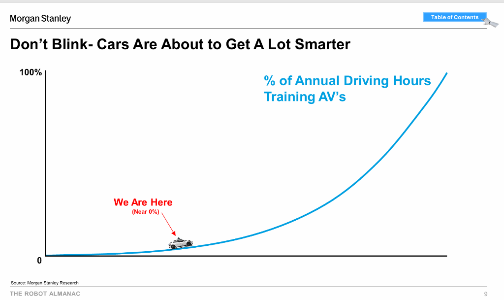 全球汽车行业正站在一个巨大的转折点上。据大摩21日发布的《机器人年鉴第六卷:自动驾驶汽车》(The Robot Almanac Vol. 6: Autonomous Vehicles),分析师Adam Jonas团队指出,尽管人类目前每年累计在汽车内花费的时间相当于8200万年,但这一传统的驾驶模式即将被打破,自动驾驶技术正处于从“0到1”爆发的前夜。