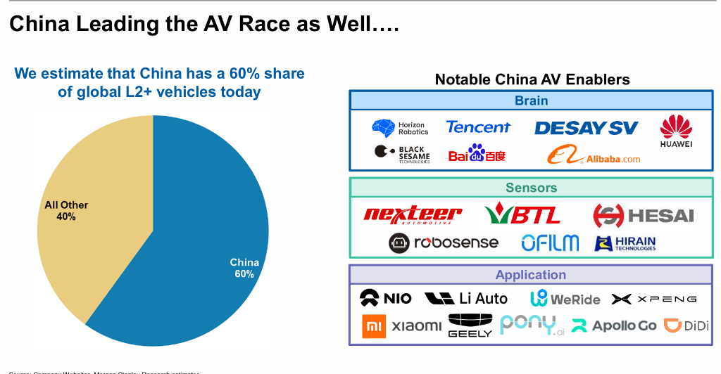 在这一轮全球技术竞赛中,大摩明确指出中国已经处于领先地位。据追风交易台消息,报告数据显示,中国目前拥有全球约60%的L2+级自动驾驶汽车份额,这不仅得益于中国在电动汽车(EV)领域的胜利,更在于其通过海量电动车队构建的“数据探针”优势。