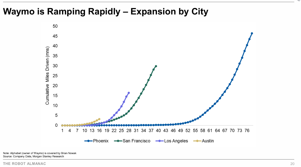 与此同时,美国市场的竞争格局也正发生深刻变化,Waymo与特斯拉之间的路线之争愈演愈烈。Waymo正在从凤凰城、旧金山等地向洛杉矶、奥斯汀及亚特兰大等全美主要城市快速扩张,其运营里程预计将在未来几年实现爆发式增长;而特斯拉采取的纯视觉方案则被视为“刚刚起步”,虽然硬件成本极低,但旨在通过庞大的车队数据实现超越。报告将当前的传感器技术路线之争比作19世纪末的“电流之战”(War of the Currents),认为不同的技术路径或将在未来长期共存。