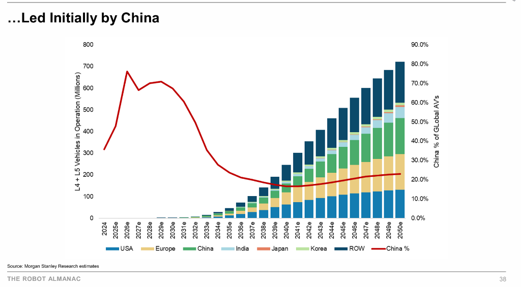2030年: 全球约有220万辆全自动驾驶汽车。 2040年: 这一数字将指数级增长至2.45亿辆,届时大部分在路上的汽车将是智能化的。 2050年: 全球自动驾驶汽车保有量将突破7.22亿辆。不仅是中美巨头,全球范围内的一批新兴企业也在加速这一进程。报告提到了英国的Wayve,致力于通过“AV 2.0”端到端AI模型实现自动驾驶;美国的Applied Intuition,为车企提供仿真和软件验证工具;以及中国的WeRide和小马智行,这两家公司不仅在中国主要城市运营Robotaxi,业务还延伸至中东和欧洲,并已登陆美股市场。大摩总结道,随着技术成熟和成本下降,自动驾驶将从科幻概念转变为全球经济中不可忽视的实体力量。