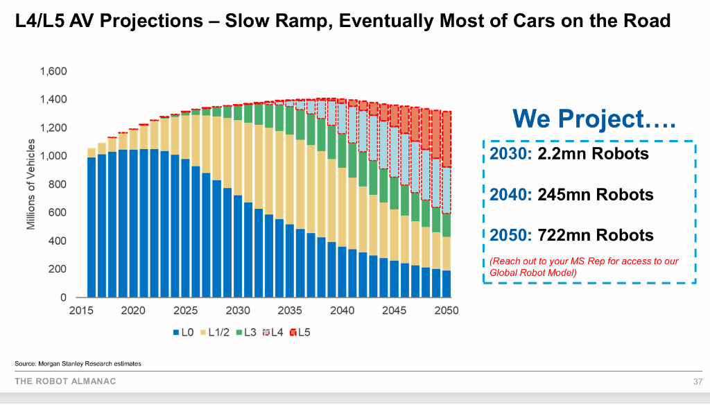 展望未来,大摩描绘了一条陡峭的采用曲线。根据其预测模型,自动驾驶汽车的销量渗透率将在未来几十年内从几乎为零飙升至接近100%。
