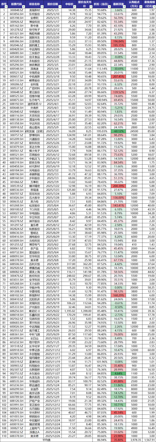 截至2025年12月28日,2025年共有110个竞价项目发行,平均折扣率有86.94%,发行折扣最高的南山智尚(发行当日折扣62.08%),东方电气、麦捷科技、深高速、保利发展(定转)发行出现了倒挂现象。