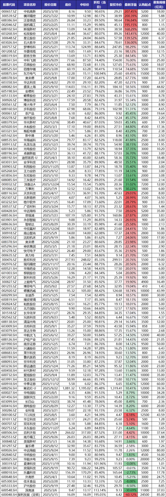 表:2025年已发行定增项目浮盈情况(浮盈从高至低排序,截至12.28)