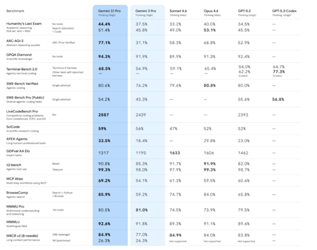 据官方披露,Gemini 3.1 Pro在多项严苛基准测试中表现卓越。以评估逻辑模式处理能力的ARC-AGI-2测试为例,该模型实测成绩达77.1%,推理性能较上一代Gemini 3 Pro提升超一倍。
