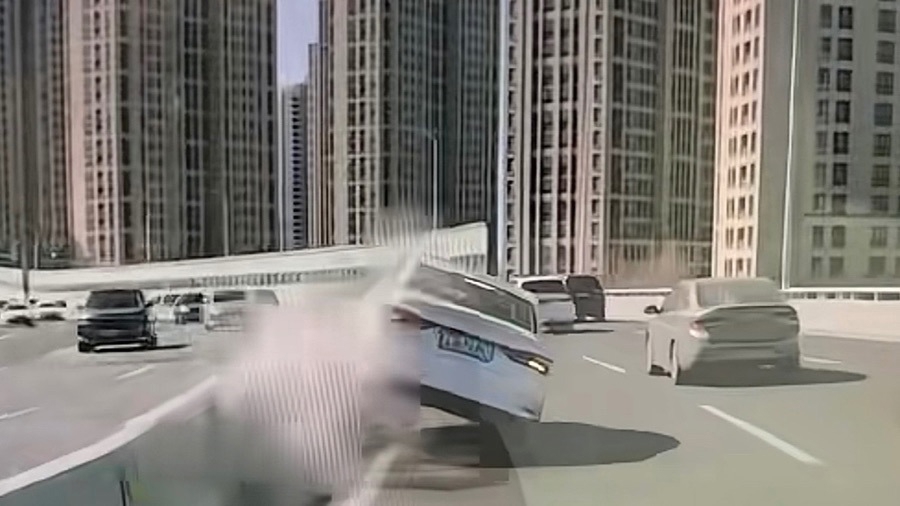 网友的行车记录仪画面显示,一辆白色轿车沿南北高架往浦江镇方向的二号车道行驶,当车辆行至靠近耀华路出口路段附近时,疑因车速过快,驾驶员向左打偏方向后,撞上高架中央水泥隔离墩。肇事轿车反弹至右侧车道,擦撞另一辆正常行驶的轿车,之后又撞上高架右侧护墙,之后缓慢停下。