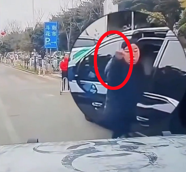 后方车辆的驾驶者先后通过鸣笛与开启右转向灯的方式示意前车让开通道,但前车女子仅回头看了一眼,依旧继续在车旁收拾物品,没有移动车辆的意图。两车短暂停滞后,现场画面显示,女子突然抬起胳膊,向后方车辆做出具有挑衅意味的手势,使现场气氛迅速紧张。