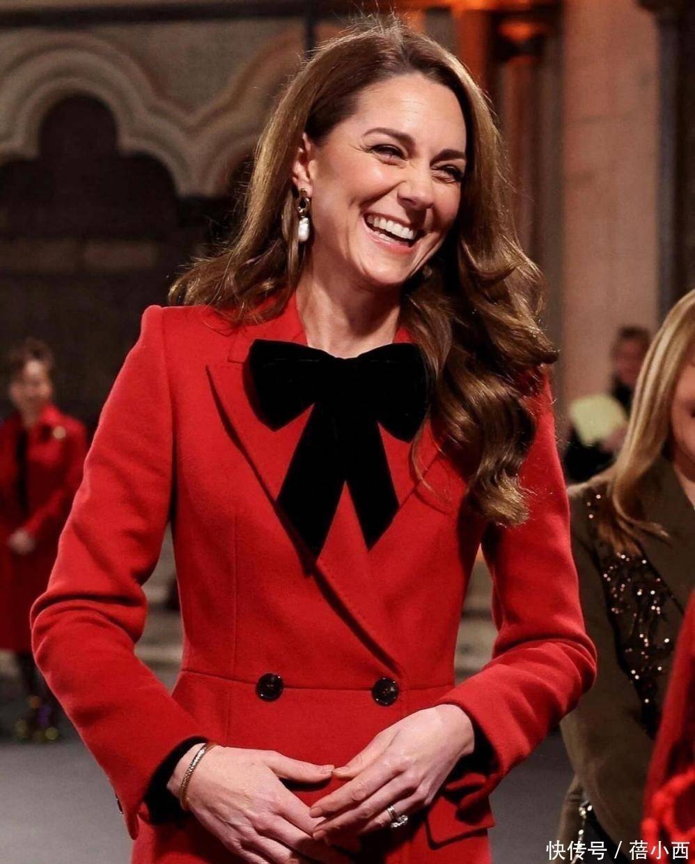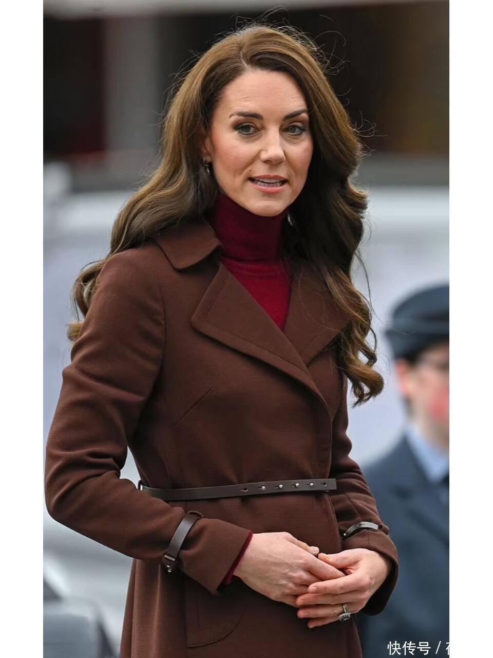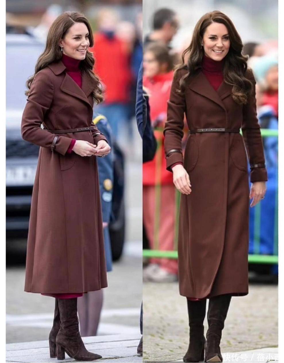 再看凯特王妃身上穿的这一件深棕色大衣,色泽如同浓郁的巧克力,给人一种温暖而沉稳的感觉,面料质地优良,保暖性能极佳,适合在寒冷的冬季穿着,再加上腰部的收腰设计能够很好地修饰身形,轻轻松松展现出了凯特王妃的优雅气质,她在里面搭配的是一件红色高领衫,颜色和大衣形成对比,会加强搭配的层次感。