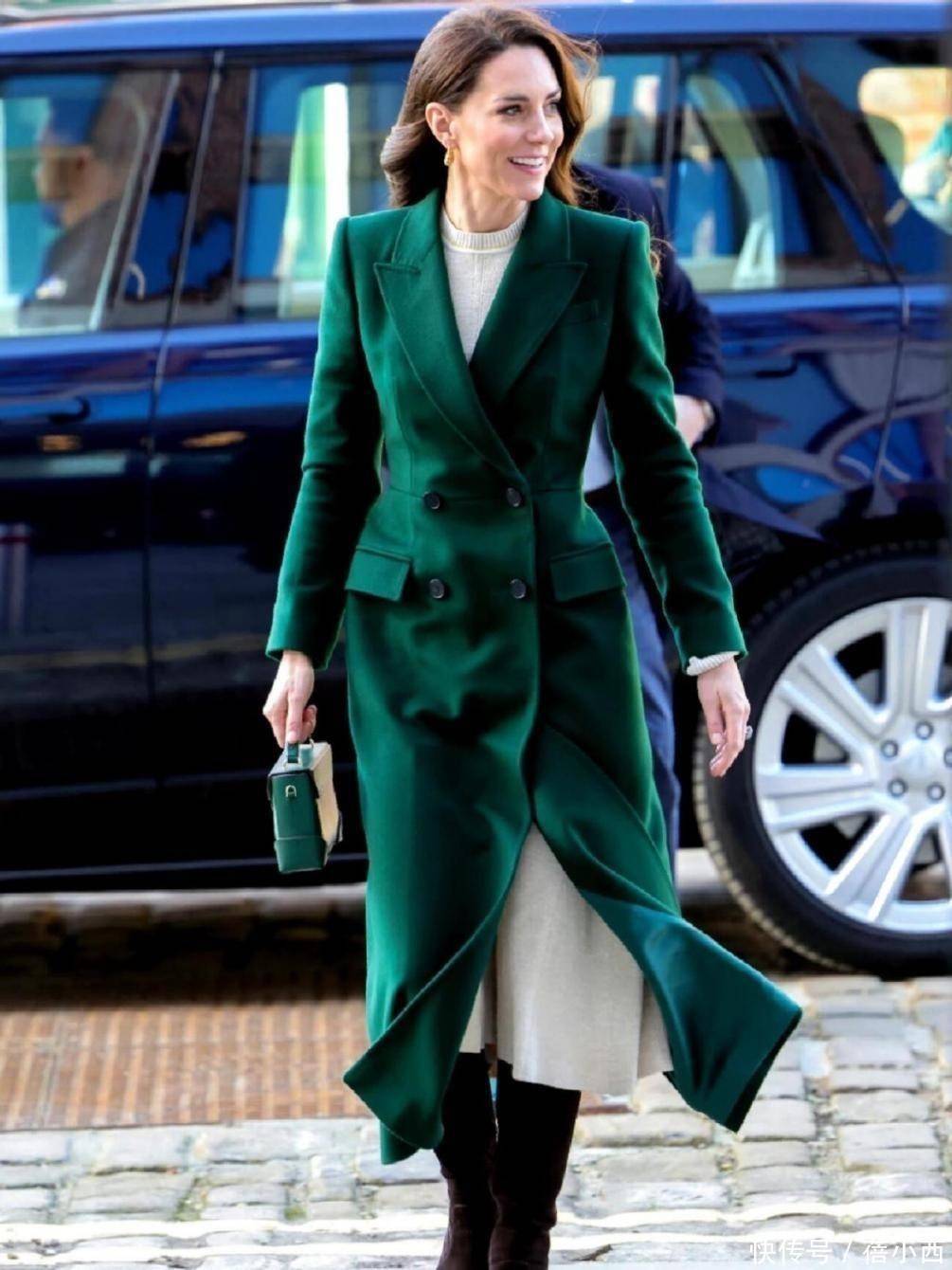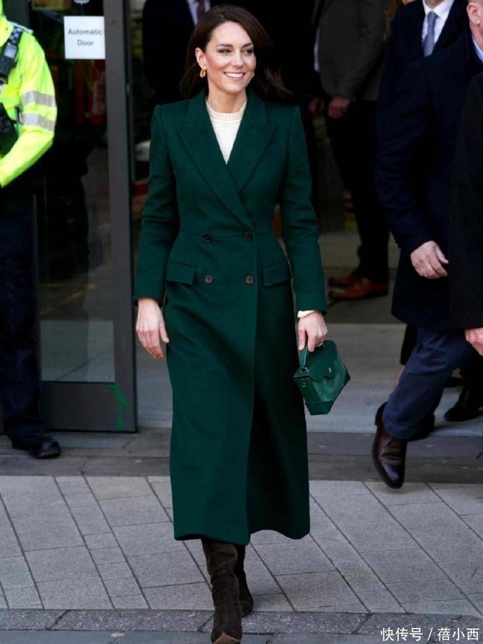 例如凯特王妃这一身绿色大衣搭配过膝半身裙,大衣的线条流畅,质感上乘,彰显出她端庄大气的气质,下半身搭配半身裙,过膝不过踝的长度刚刚好,裙摆处微微散开,随着她的步伐轻轻摇曳,散发出迷人的魅力,既符合正式场合的着装要求,又展现出了凯特王妃独特的时尚品味。